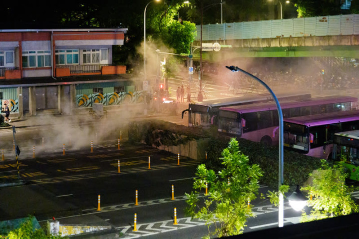 报道称,台军方在新北八里区商港九路提前设置了“6道阻绝”障碍,分别包括混凝土块、混凝土预制“新泽西护栏”、反坦克拒马及铁丝网、(美制“艾斯科”HESCO)网箱式防爆墙、集装箱和从民间旅游公司征用的大型客车,以完全阻塞道路通行功能。此外,台军还出动了“战术近程无人机”,以示进行“观测和侦察”作业。